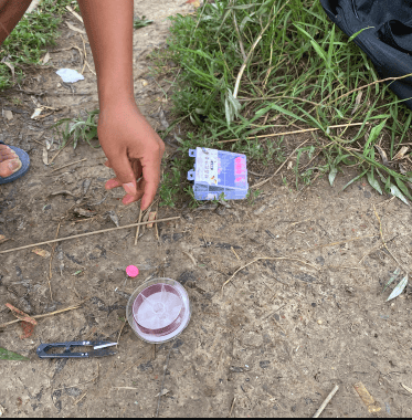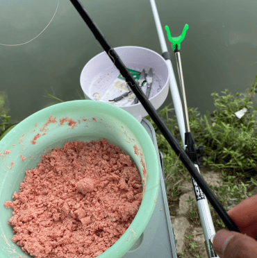 到了下午两三点的时候,我左手搓耳搓的手疼,频繁提杆有点累了,正好饵料快用完了,我借旁边老哥拉丝粉又搞了一些饵料。