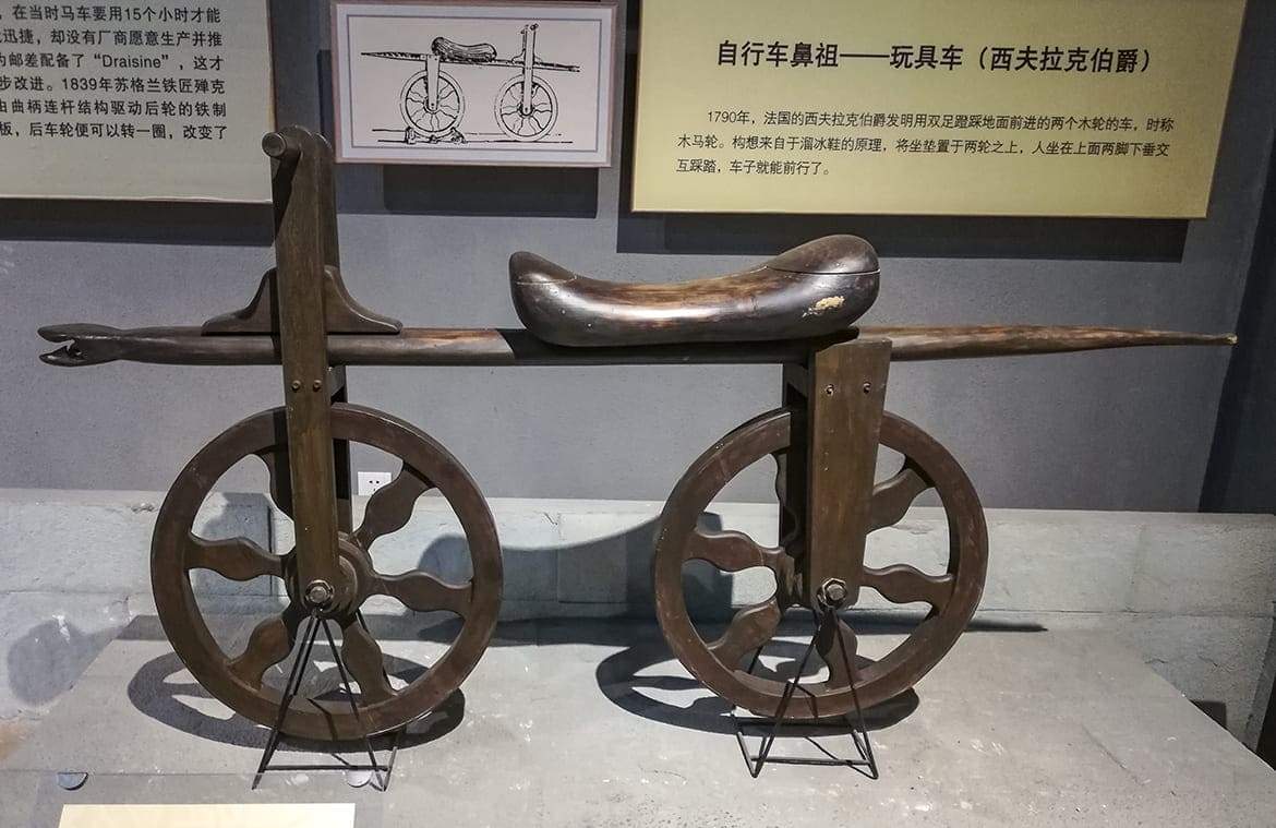 在河南老家,人们通常称自行车为“洋车子”。确实,是洋鬼子的杰作,早在1791年,法国佬西夫拉克设计出了世界上第一辆自行车,据说他是受溜冰鞋的启发,整车为木制,上管由一根大横梁作为主体车架,下方装两个木制车轮,没有转向结构,拐弯全靠搬。当然,它也没有传动系统,骑多快这就真看腿了